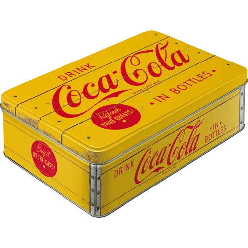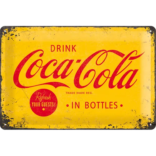 Vor einem komplett gelben Hintergrund zeigt dieses Design den roten Coca-Cola-Schriftzug und die Phrase „Drink Coca Cola“. Es weicht vom traditionellen rot-weißen Farbschema ab und hebt stattdessen das Logo in einer alternativen, aber ebenso auffälligen Farbkombination hervor.