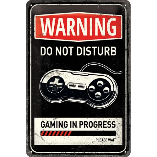 Dieses Warnschildmotiv zeigt einen schwarzen Hintergrund mit einem roten Sechseck und den Worten „Warning: Do Not Disturb - Gaming in Progress“. Ein Spielcontroller im Vintage-Stil ist abgebildet, der einem alten Nintendo-Modell ähnelt, zusammen mit einem Fortschrittsbalken unter dem Text. Das Design ahmt ein klassisches Warnschild nach und nimmt die Hingabe des Spielers auf humorvolle Weise auf.