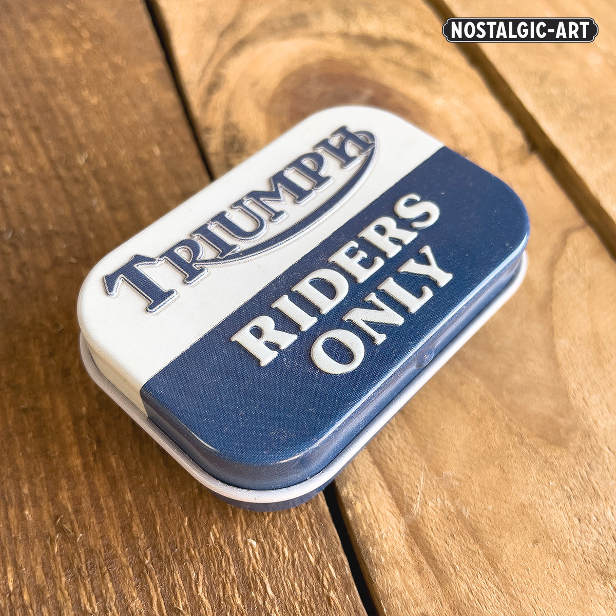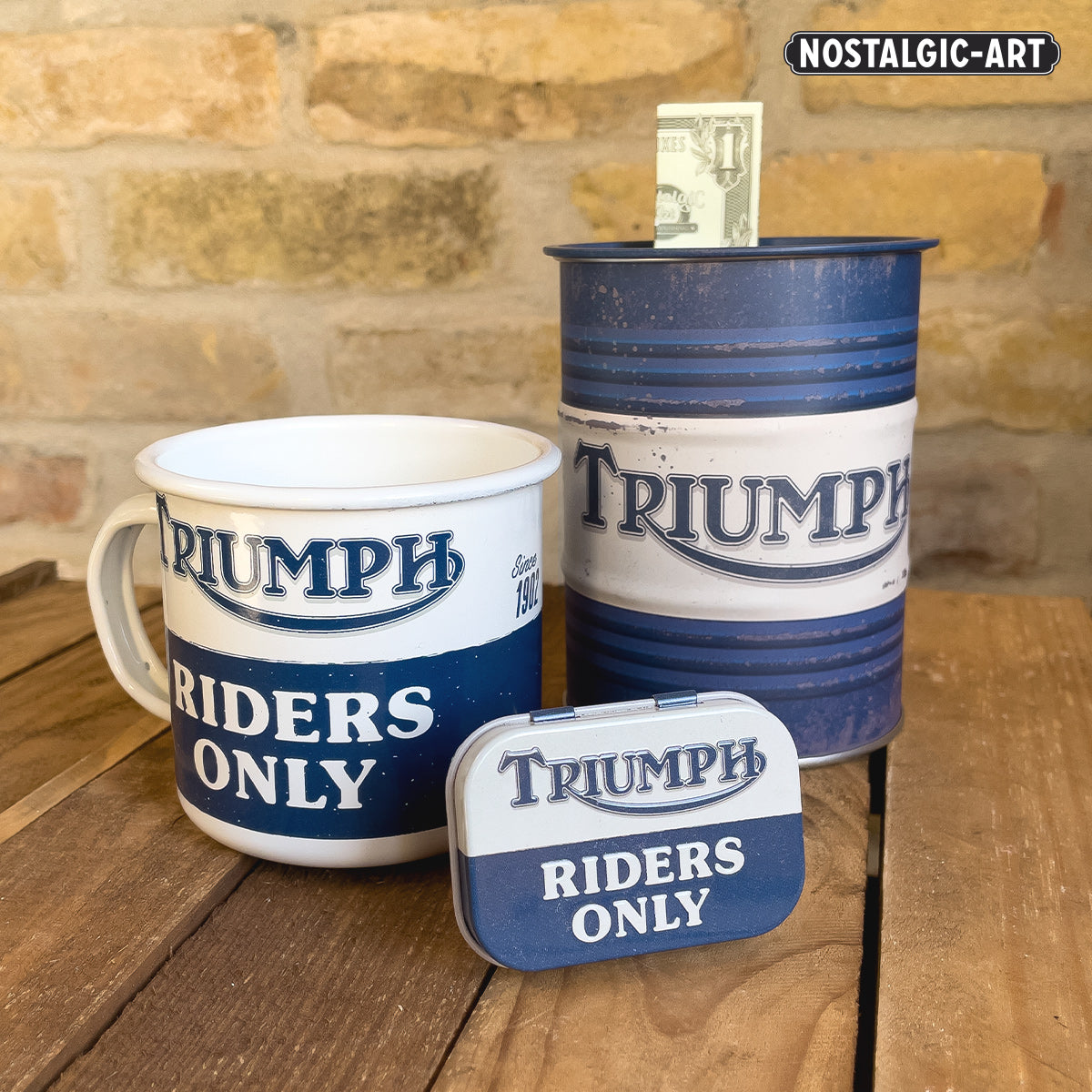 Die Triumph Retro-Kollektion feiert die legendäre Motorradmarke und bringt deren ikonischen Stil in den Alltag. Mit Artikeln wie Blechschildern, Aromadosen, Tassen und Wanduhren spiegelt die Kollektion Triumphs unverwechselbare Ästhetik und Leidenschaft wider. Jedes Produkt ist eine Hommage an die Geschichte der Marke und ein Muss für echte Motorradliebhaber, die den Geist von Triumph in ihr Zuhause holen möchten.