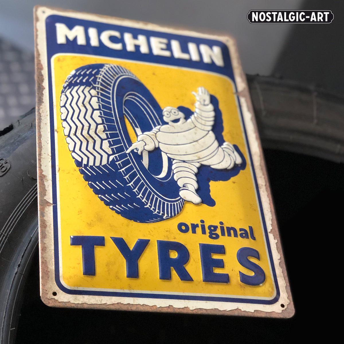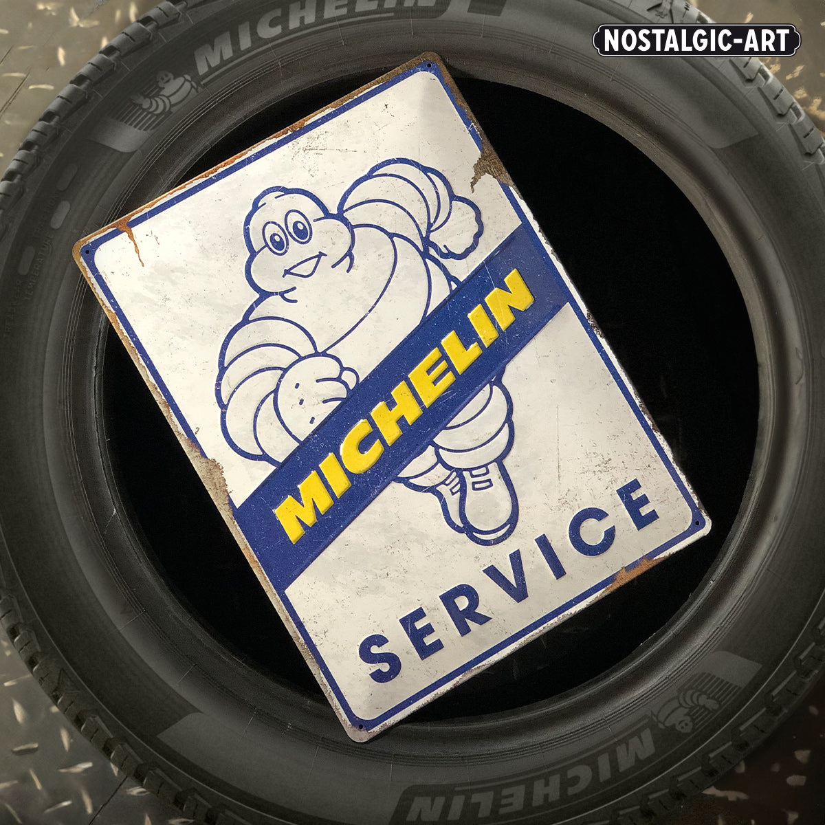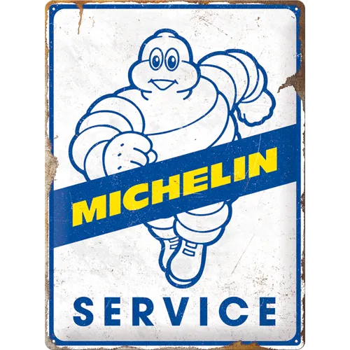 Dieses Design im schlichten Vintage-Look zeigt das Bibendum aus den 1920er Jahren vor einem weißen Hintergrund mit dem Wort „Service“. Der stark abgenutzte Look mit sichtbarem Rost und abgenutzten Kanten sorgt für ein authentisches Retro-Gefühl und ist eine großartige Darstellung der langjährigen Service-Tradition von Michelin. Es vermittelt den nüchternen Ansatz für Qualität und Zuverlässigkeit, der seit Jahrzehnten ein Synonym für die Marke Michelin ist.