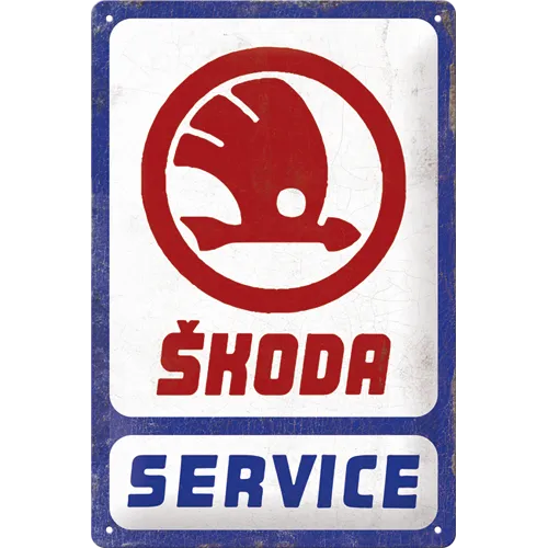 Dieses Design zeigt einen weißen Hintergrund mit einem roten, separaten Skoda-Logo, das das traditionelle geflügelte Pfeilemblem enthält, und darunter die Aufschrift „Service“. Es spiegelt das ältere Skoda-Logo und Farbschema wider und ähnelt der authentischen Beschilderung, die in historischen Skoda-Servicestellen verwendet wurde.