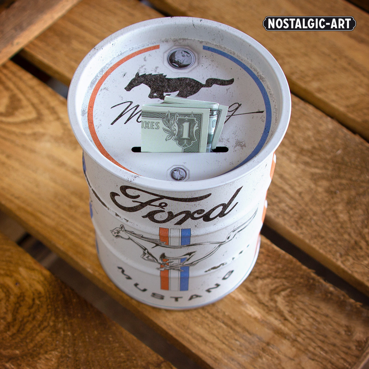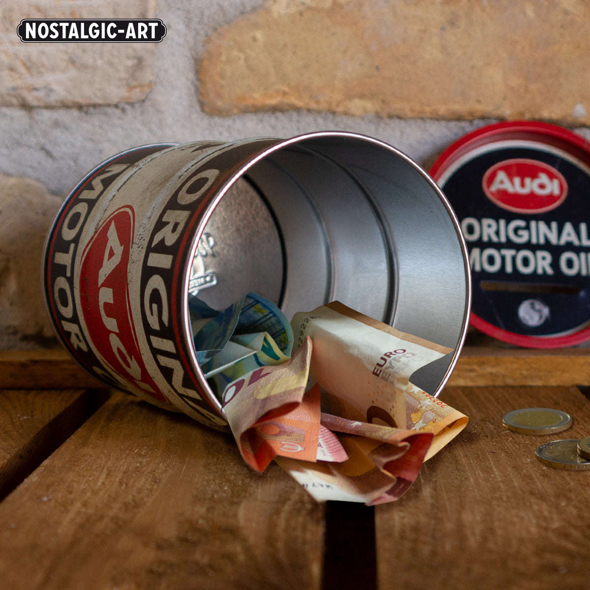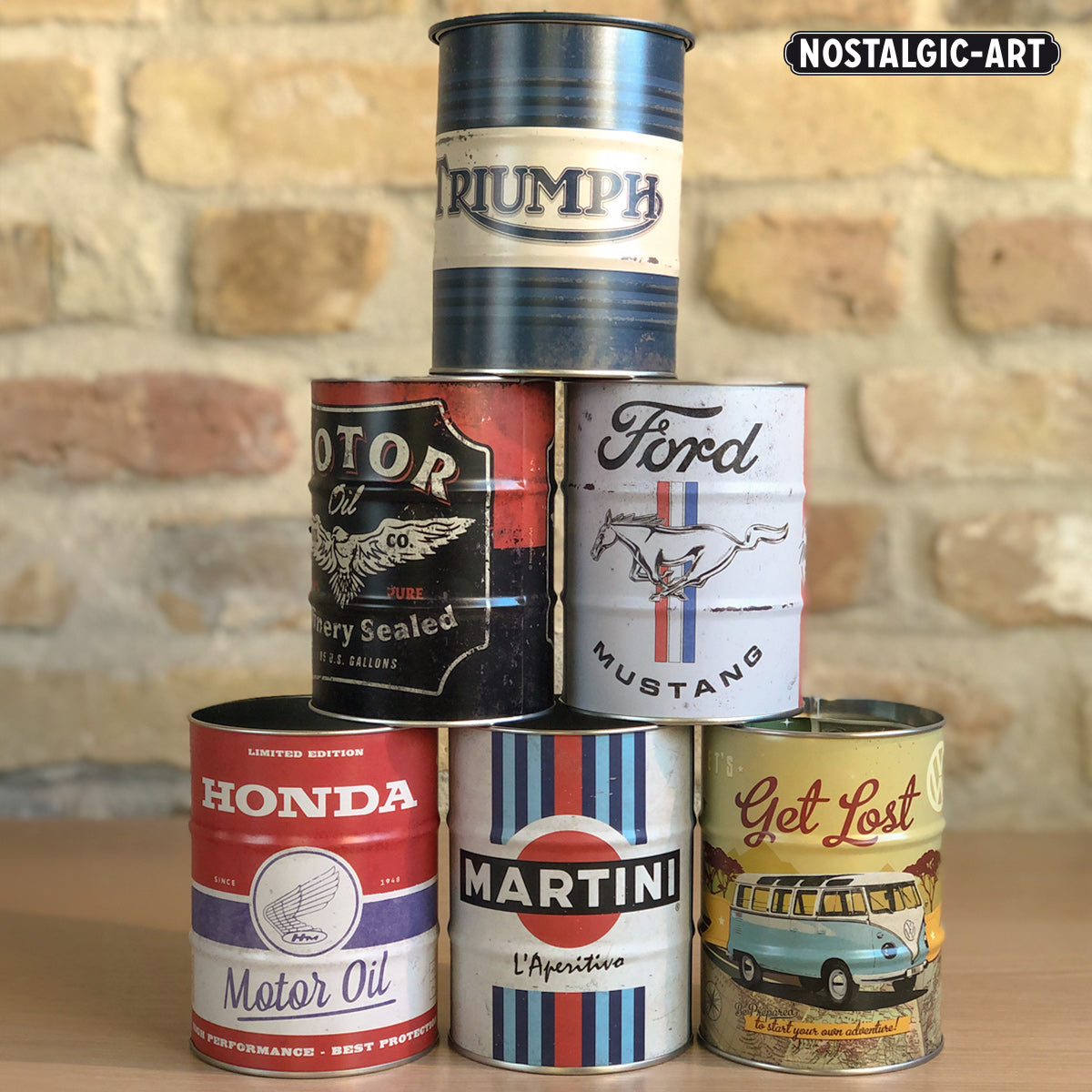 Die Ölfass-Spardosen haben eine Höhe von 11,7 cm und einen Durchmesser von 9,3 cm, mit einer Kapazität von 600 ml. Sie werden aus robustem Blech gefertigt, was eine lange Haltbarkeit gewährleistet. Die Spardosen sind in einem Design gehalten, das dem Stil eines typischen Ölfasses nachempfunden ist, inklusive geprägter Ölfassringe, die eine realistische Haptik bieten. Die Motive und Farben werden mit mattem Lack aufgetragen und enthalten Texturen, die den Eindruck von abblätterndem Lack und auslaufendem Öl erzeugen, um ein authentisches, nostalgisches Aussehen zu erzielen.
