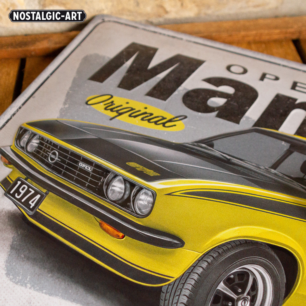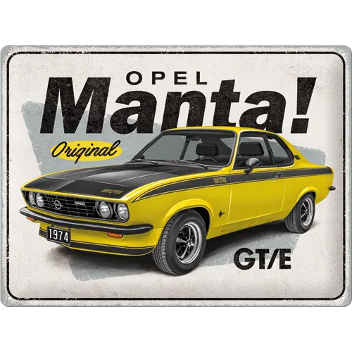 Das Design des Opel Manta in Gelb mit schwarzen Rennstreifen und schwarzer Motorhaube unterstreicht den sportlichen Look des Manta GT/E, dem Pendant zum Golf GTI. Der Hintergrund besteht aus einer kühnen Trapezform, die die Präsenz des Fahrzeugs unterstreicht. Das Motiv spiegelt den Kultstatus des Manta wider, der in der Popkultur und der Automobilgeschichte gefeiert wird.