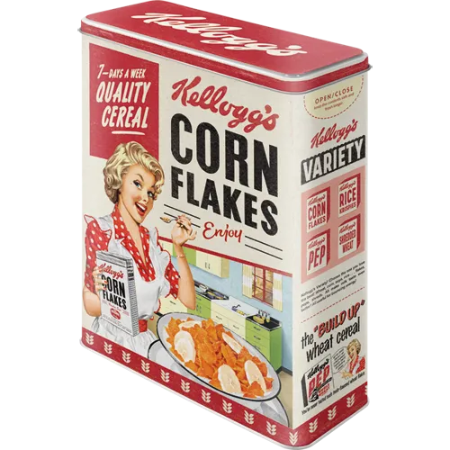 Our XL storage tin is the perfect blend of functionality and nostalgic design. Measuring 8 x 19 x 26 cm with a capacity of 4 liters, this tin is ideal for storing breakfast cereals and other dry goods. Crafted from durable metal and meticulously printed with vibrant, four-color designs, it features a matte finish and embossed details that add a touch of dimension and elegance. Beyond its charming retro aesthetic, this tin keeps your food fresh and protected from moisture, making it a stylish yet practical addition to any kitchen. Whether you’re organizing your pantry or looking for a unique gift packaging solution, this tin offers a decorative and sustainable alternative to ordinary storage options.
