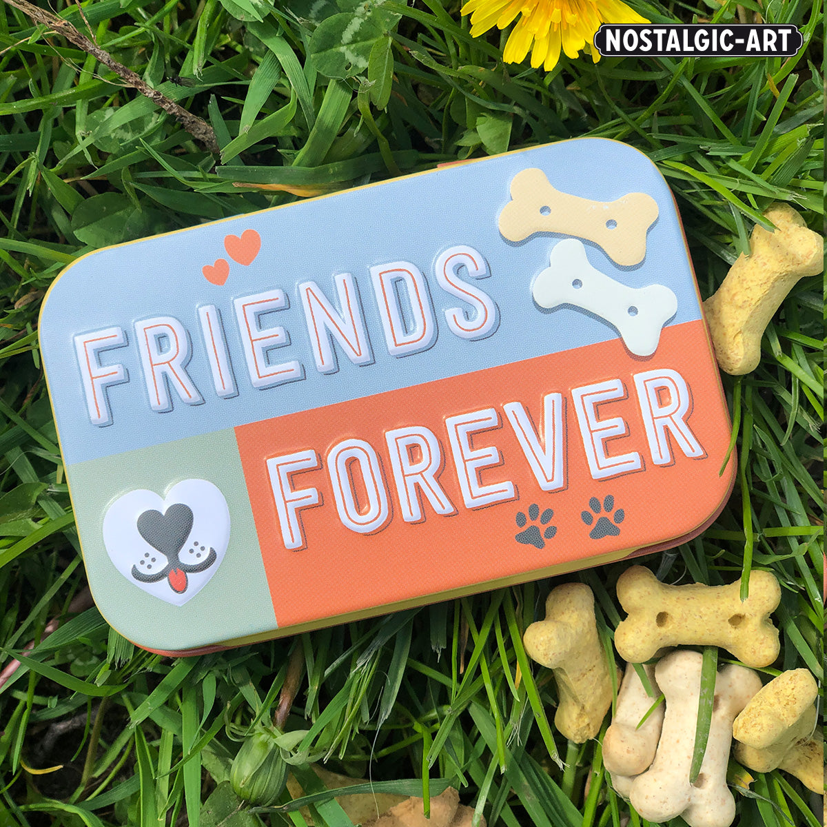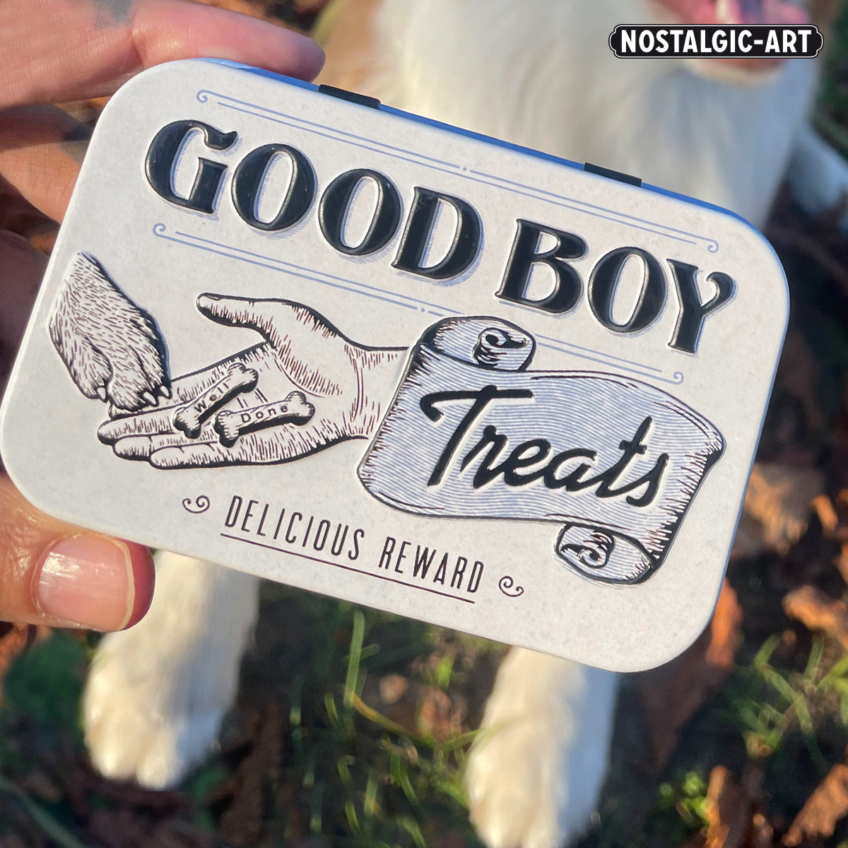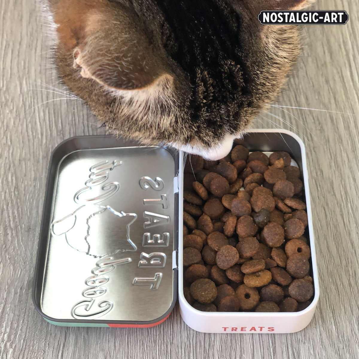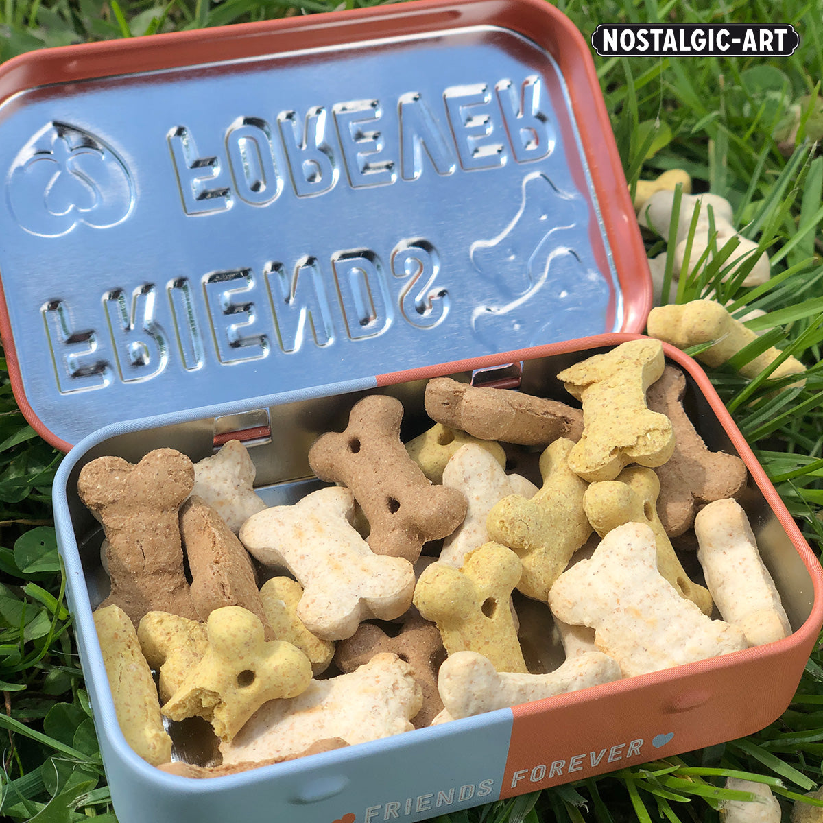 Our Nostalgic-Art Leckerli tins are crafted from durable tin and designed with both practicality and style in mind. Measuring 6 cm x 9.5 cm x 2 cm, these tins are the perfect size for on-the-go, fitting easily into any pocket. Available in nine unique designs from our “Animal Club” and “PfotenSchild” collections, each tin features beautifully detailed motifs and inscriptions centered around dogs and cats. The matte finish in pastel shades or vibrant pop-art colors, combined with a multi-layered embossed lid, gives these tins a premium 3D appearance. Although they are not completely airtight, they are perfect for keeping dry treats fresh for longer. These tins not only provide a convenient way to carry your pet’s favorite snacks but also serve as a valuable training tool—use the rattling sound as a conditioning method to make training sessions more effective. With their nostalgic designs, these tins add a charming retro touch to any pet owner’s routine, making them a decorative accessory for the home as well.