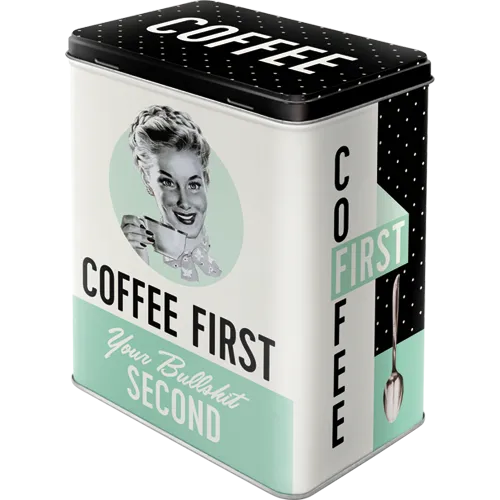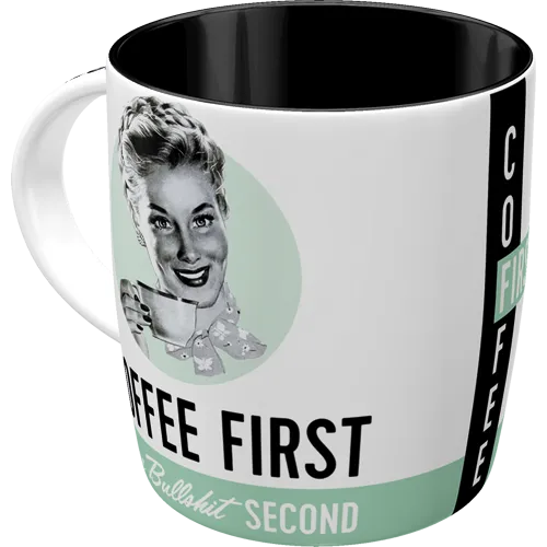 All mid-century charm, no morning nonsense. This design features a perky ’50s housewife with a fixed smile and razor-sharp wit, backed by bold black type that reads: Coffee First. Bullshit Second. Finished in soft mint and jet black, it’s retro realness with graphic bite.